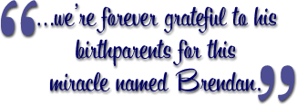 Brendan was one day old when he joined our family in January of 2004. We thank God every day for bringing us all together and we’re forever grateful to his birthparents for this miracle named Brendan. We were honored to meet them at the hospital and we continue to send letters and pictures on a regular basis so they can see how much Brendan is growing and how happy he is.